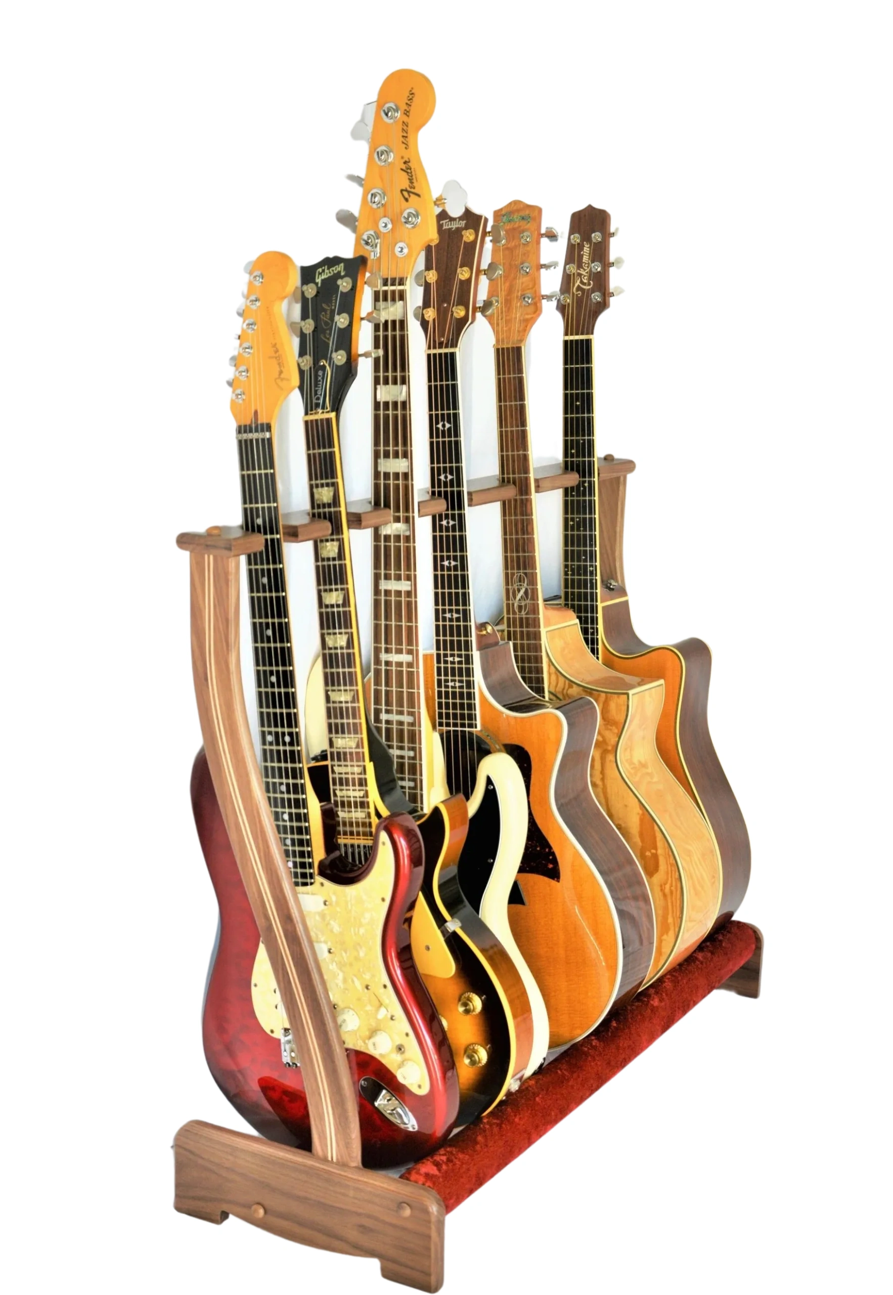 We realize that most guitarist collect a variety of instruments so we have added a new stand to the line up that accommodates both acoustic and electric guitars. This new six place hybrid stand preserves the space to keep your acoustics safe and also comfortably holds three electrics.